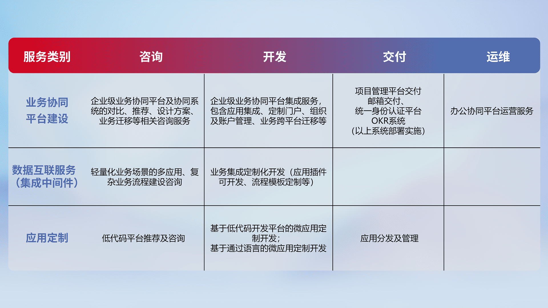 针对钉钉、、企微、、、、IDaas等平台级产品提供产品的规划、、方案、、、交付、、定制化开发等服务,,实现如统一协同办公、、智能客户服务、、、混合会议管理、、、智能数据查询、、、、等业务场景,,,实现数字化转型。。